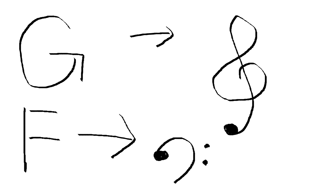 ト音記号とヘ音記号 これGとFを書体は何体だかしらないが、書いたものが変化したものらしいが、ようするに,G Fと書いてあるということ。言われてみれば、たしかにG Fに見える。安→あ 宇→う 奈→な 波→は 美→み 和→わ みたいなもので、もとの字がわからなかっただけのこと。